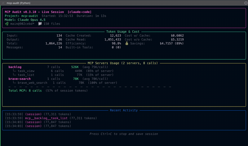 pip install mcp-auditReal-time token tracking per MCP server and toolβsee exactly what's eating your context.